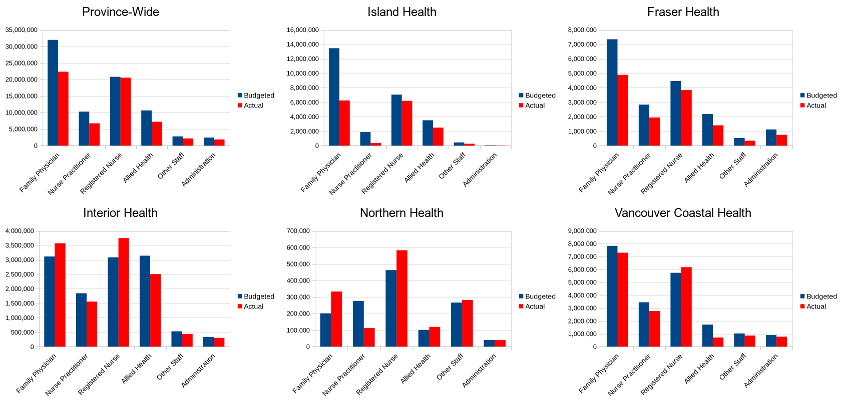 You'll notice a different proportion of budgets allotted in different health authorities. Northern Health, with its two UPCCs, budgeted $200k for family physicians (about 1 FTE). Island Health, with seven UPCCs, has budgeted for $13.4 million (approximately 65 FTE), though hit less than half (46%). Is this a case of unrealistic planning? Poor management? If UPCCs are built assuming those staffing levels, we're throwing a lot of money away on empty space and non-clinical staff.