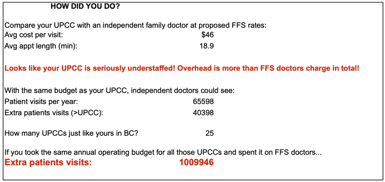 I'm paying more each visit for overhead (facilities, support staff) than FFS doctors would charge in total. And that's before factoring in costs for the doctor or nurse at my UPCC who is seeing the patient. Oops.
