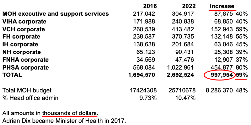 Since Adrian Dix became Minister of Health, total annual health budget has grown by $8 billion per year. Head-office admin in MOH/health authorities (bureaucrats) counts for $1 billion each and every year. Up 59%. Well-outpacing, e.g., MSP payments which support doctors (up 37%).